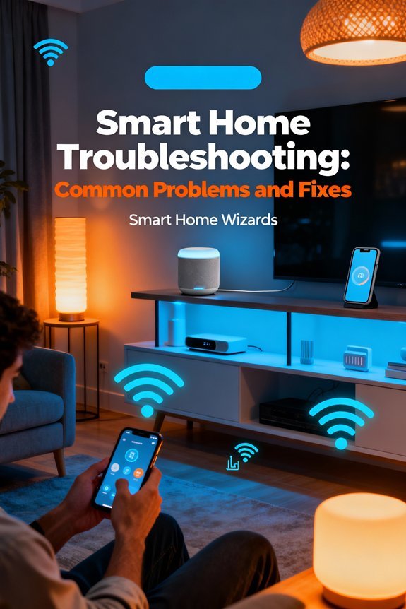 Most smart home failures stem from Wi-Fi connectivity issues—you’ll need to enhance router placement, switch to less congested 5GHz channels, and configure QoS settings for device prioritization. When voice assistants become unresponsive, verify network status before executing factory resets. Address automation failures by recreating corrupted routines and confirming protocol compatibility across your ecosystem. For thermostat inaccuracies, relocate sensors away from heat sources and calibrate offset settings. The solutions below provide systematic approaches to resolve persistent issues affecting multi-device installations.